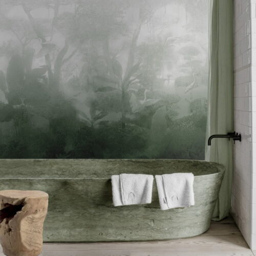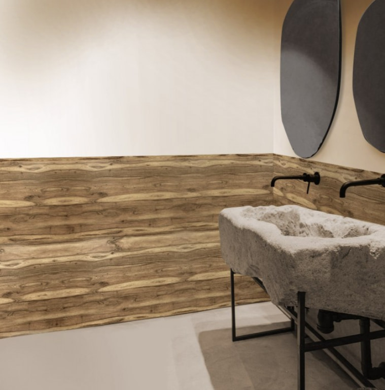 Esta textura natural se utiliza en diversos lugares del baño, ya sea en la pared de la ducha o bañera, así como en la del espejo o lavabo. Sin embargo, también es posible utilizarla para revestir muebles y suelos para forjar un ambiente cálido y sofisticado al mismo tiempo.